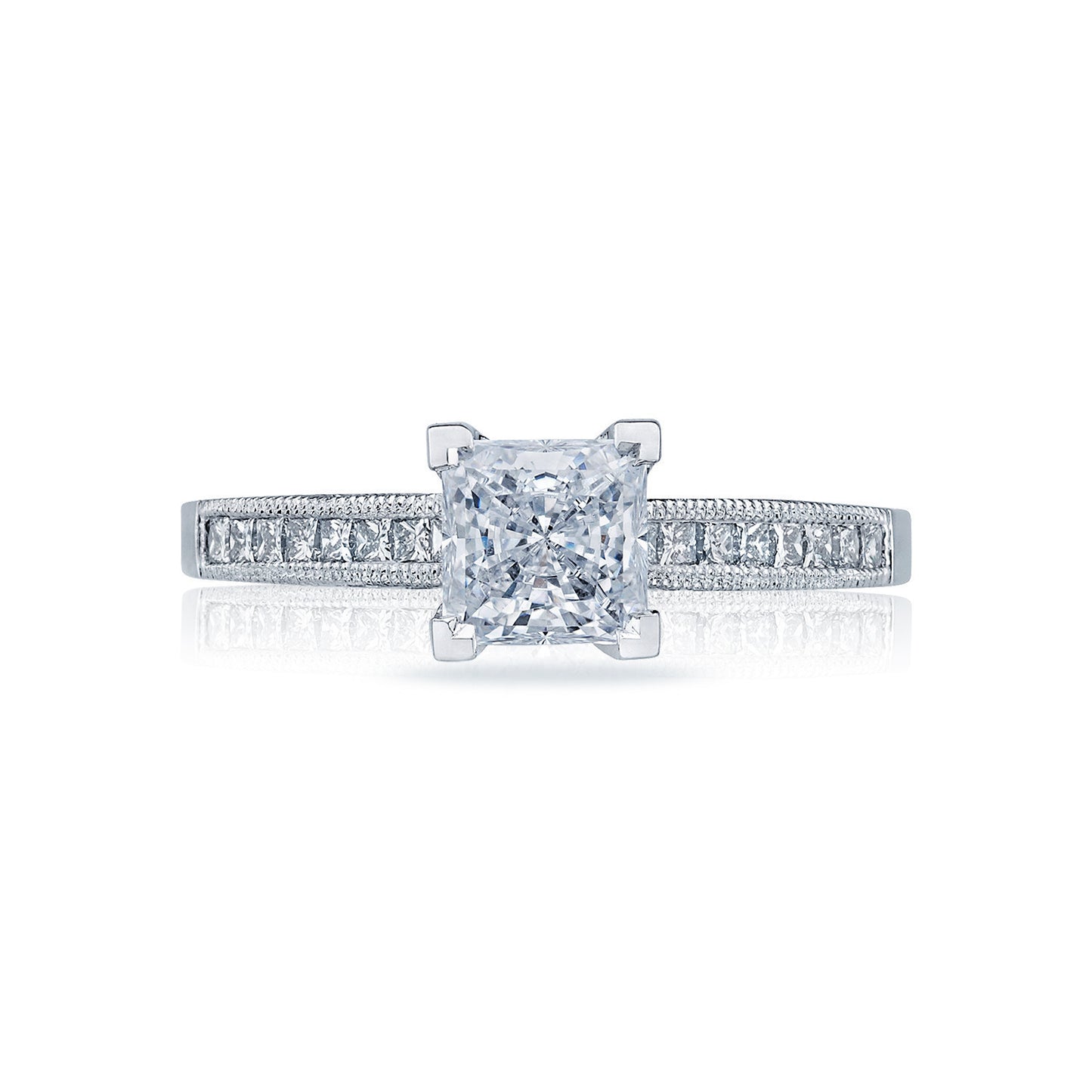 This platinum and diamond Metal is pictured with a princess-cut center diamond and princess channel-set diamonds along a band accented with round pave-set diamonds.Diamond Shape