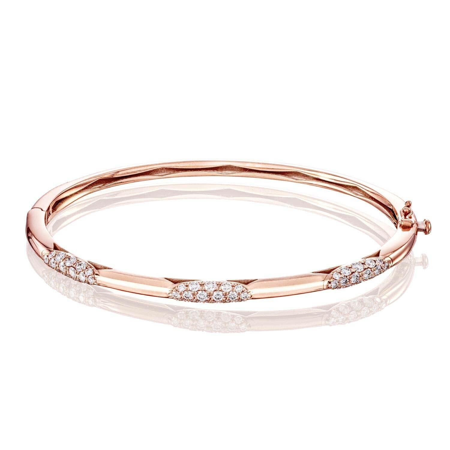 Three ellipses formed by sparkling, Diamond-studded TACORI crescents showcase unparalleled craftsmanship. Set on a delicate band of 18k gold with interior crescent detailing, this bangle is a contemporary and elegant showstopper.