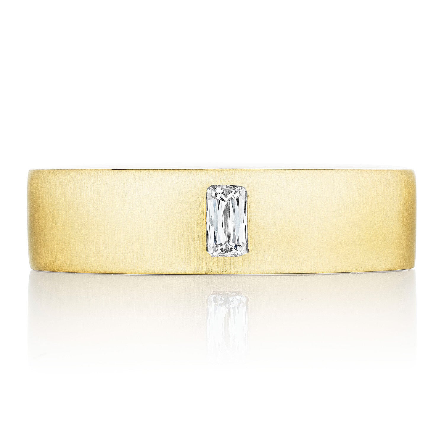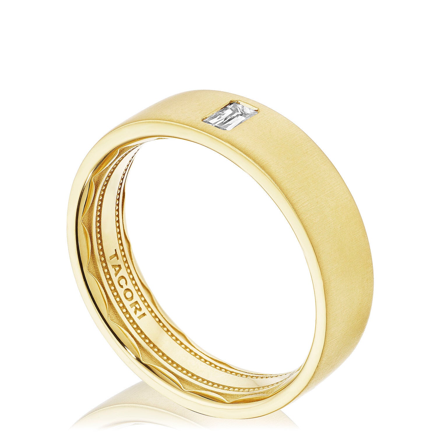A satin exterior is accented with a Tacori-exclusive triple-cut diamond, bezel-set into the flat-top band. This simple but elegant design is complemented by full sculpted crescent detail and a soft-comfort fit interior.