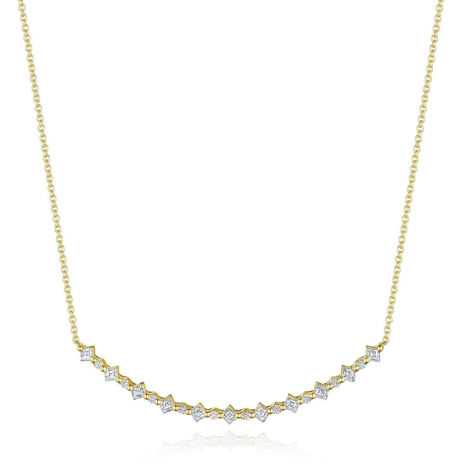A delicate string of carré and round brilliant cut diamonds hangs from a chain of 18k Gold. The silhouette of each stone is embellished with milgrain-accented TACORI Crescents.