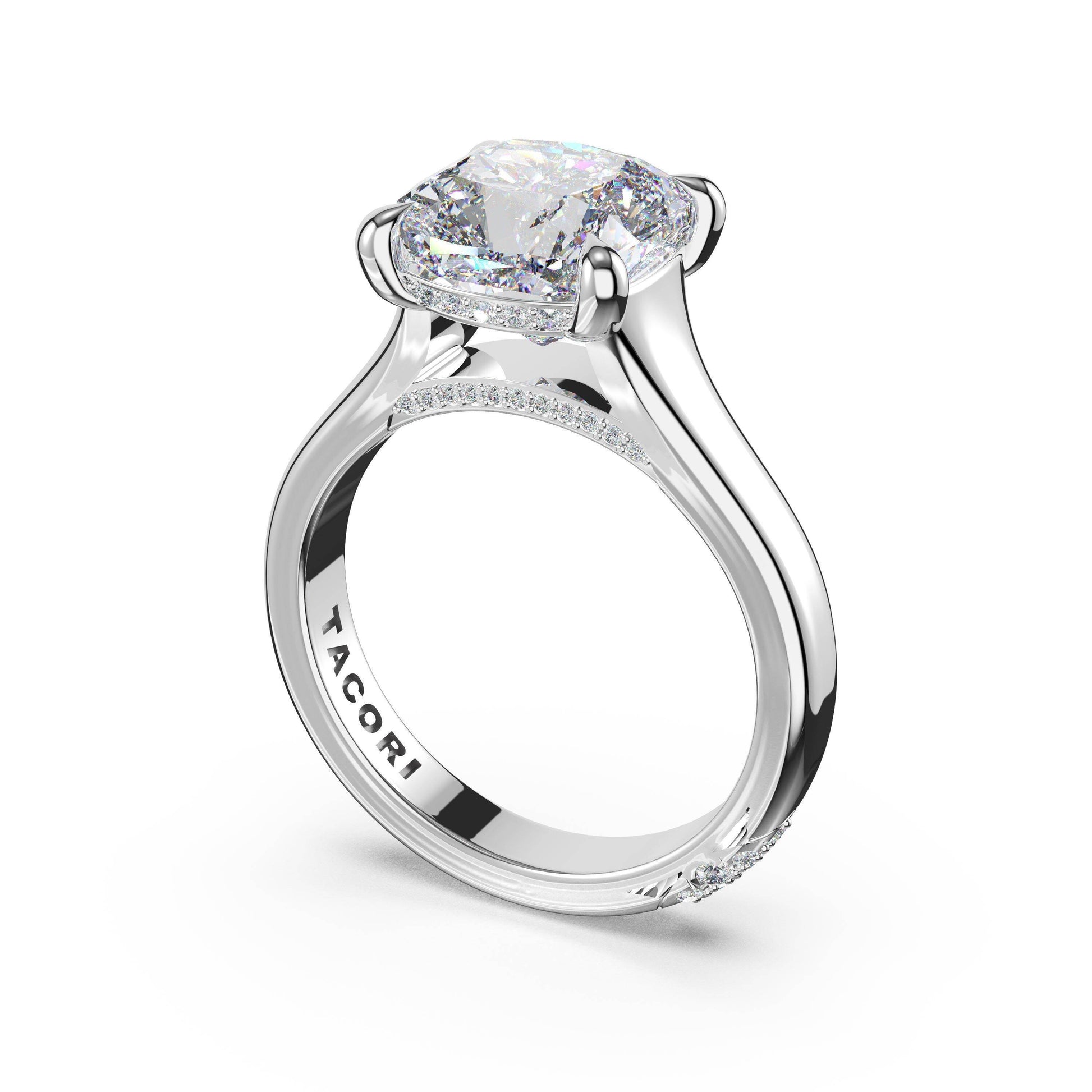 The wide band is accented with pavé diamonds that sparkle along the open gallery of the cushion-cut center stone.