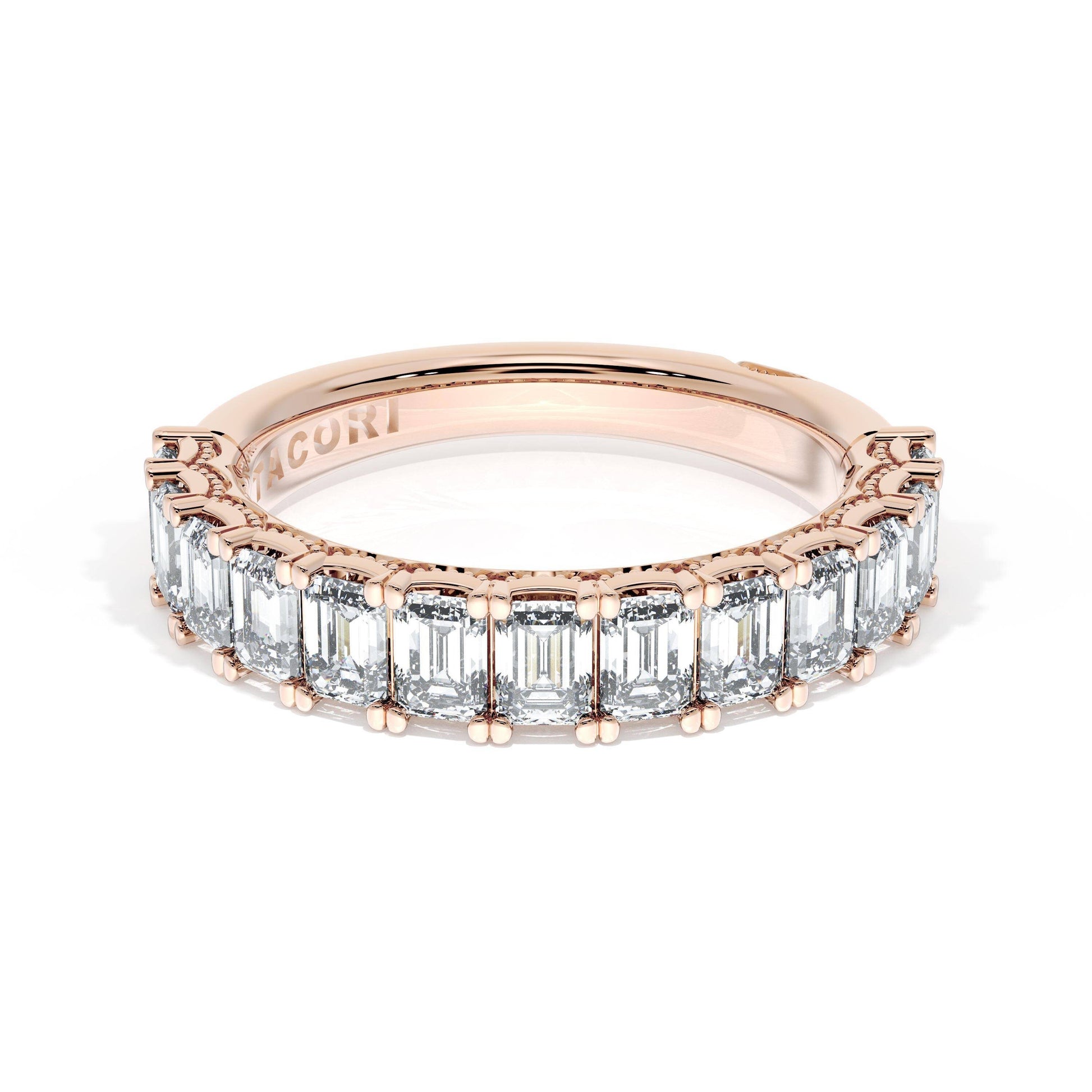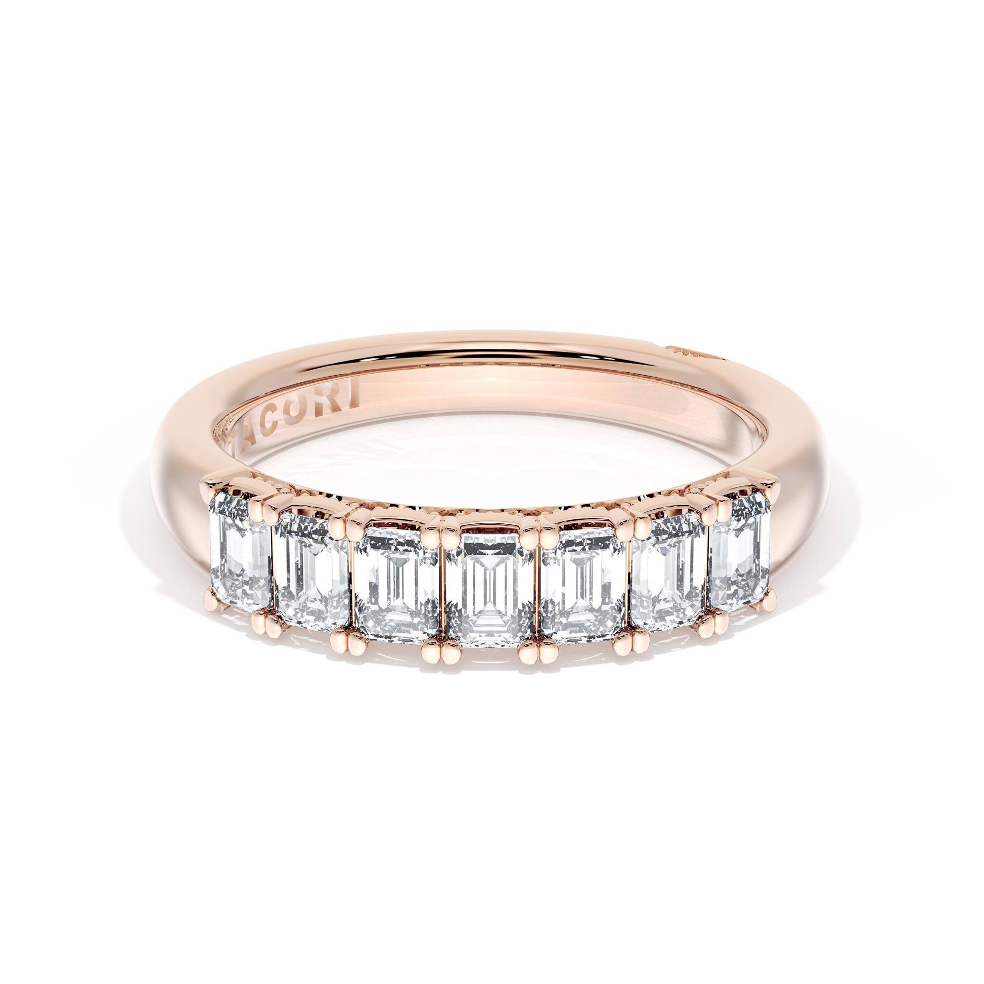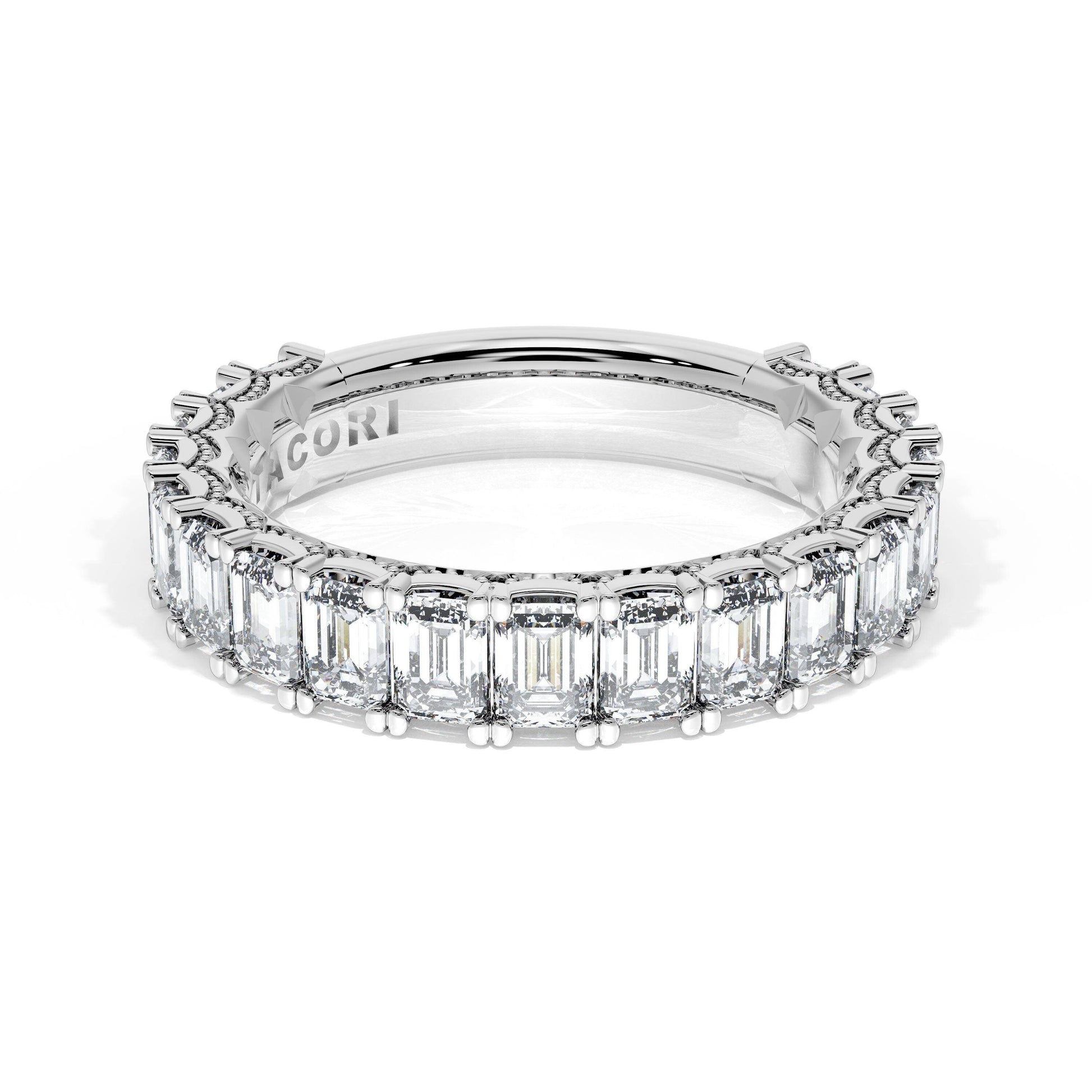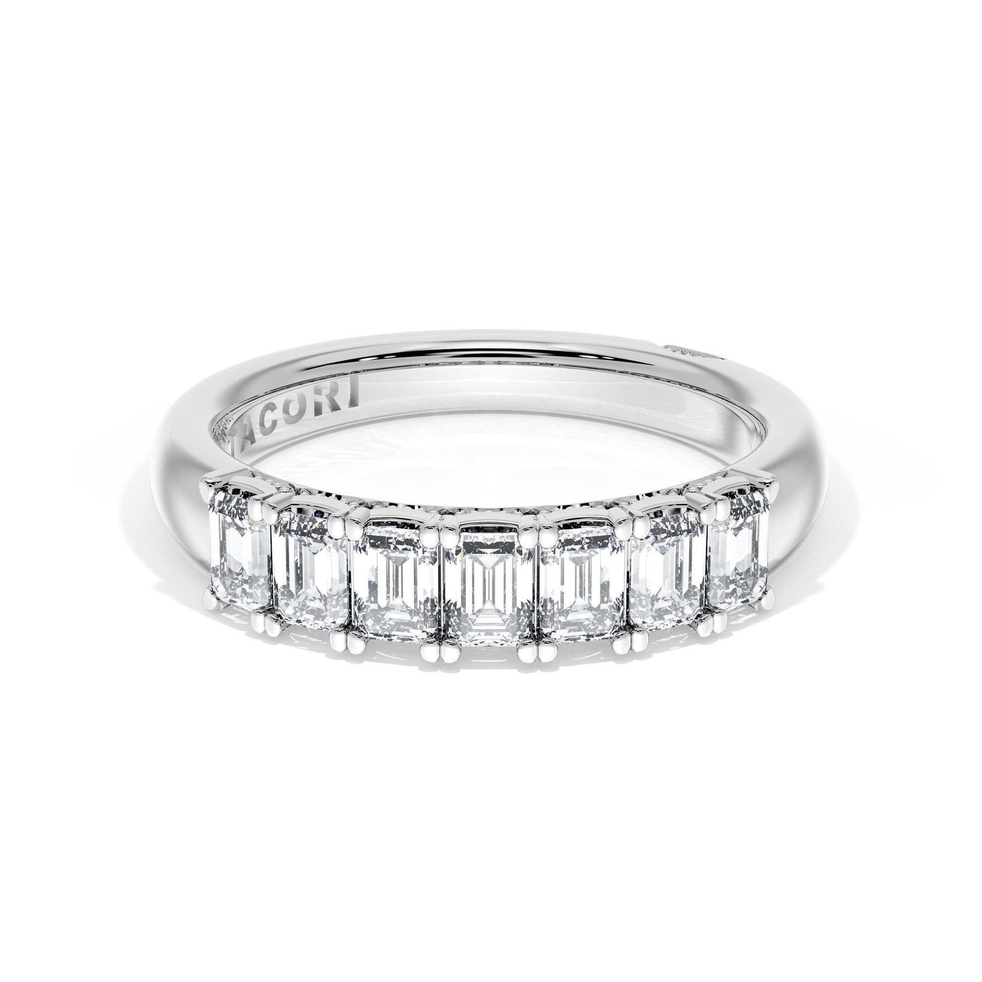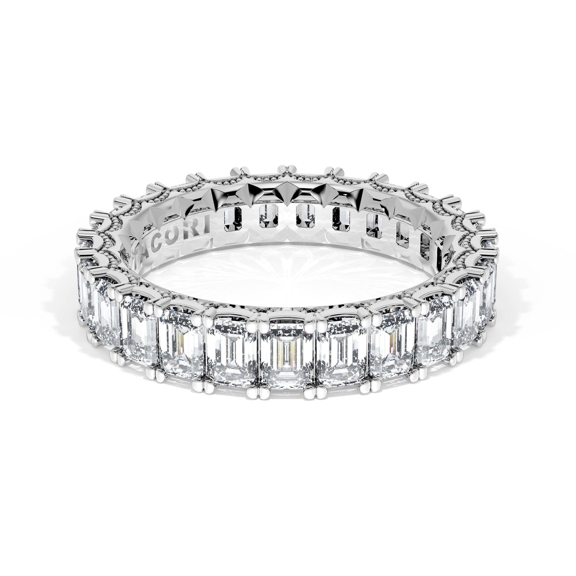 Emerald cut diamonds decorate the ceiling of this band and milgrain adds intricate texture to the silhouette.