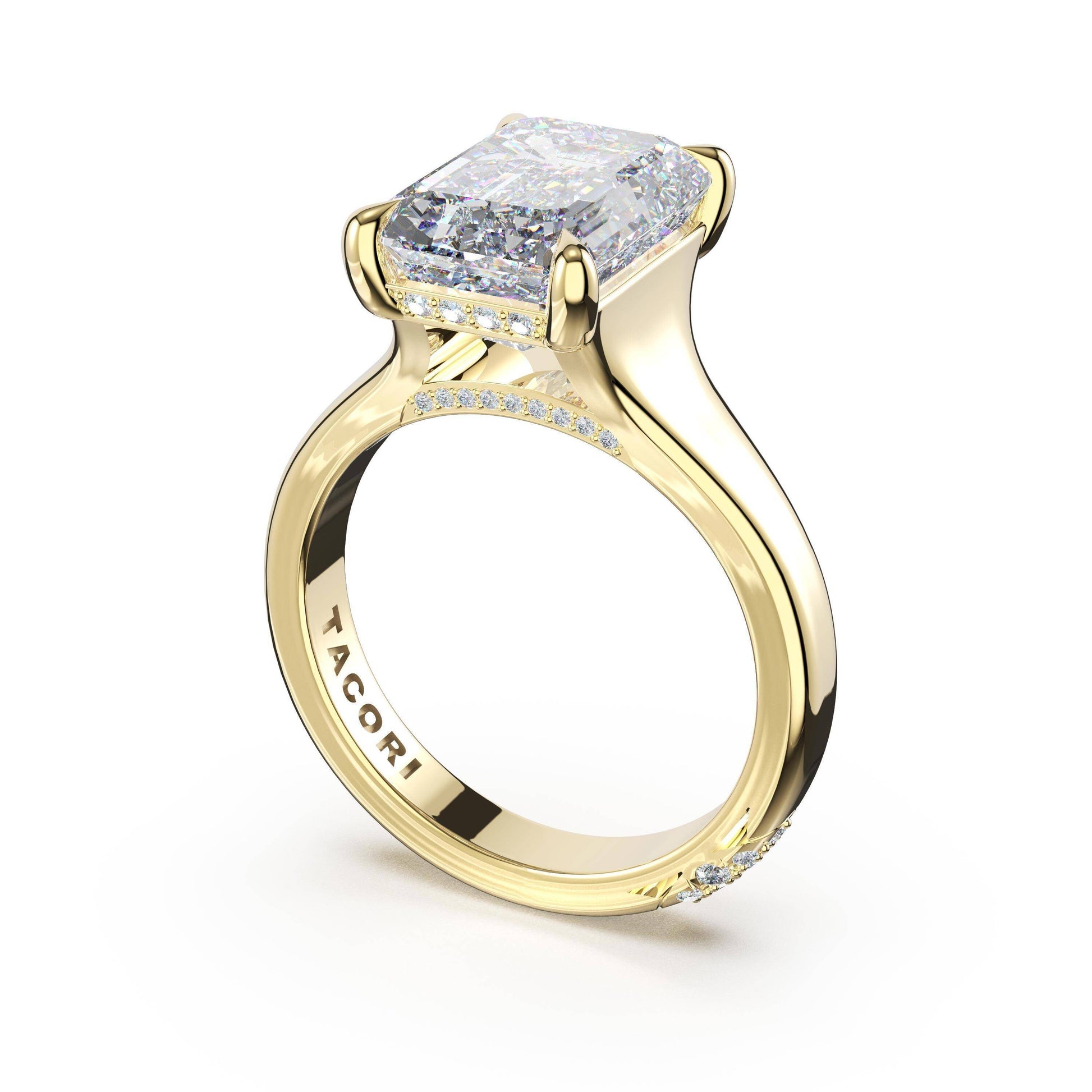 The wide band is accented with pavé diamonds that sparkle along the open gallery of the Emerald-cut center stone.