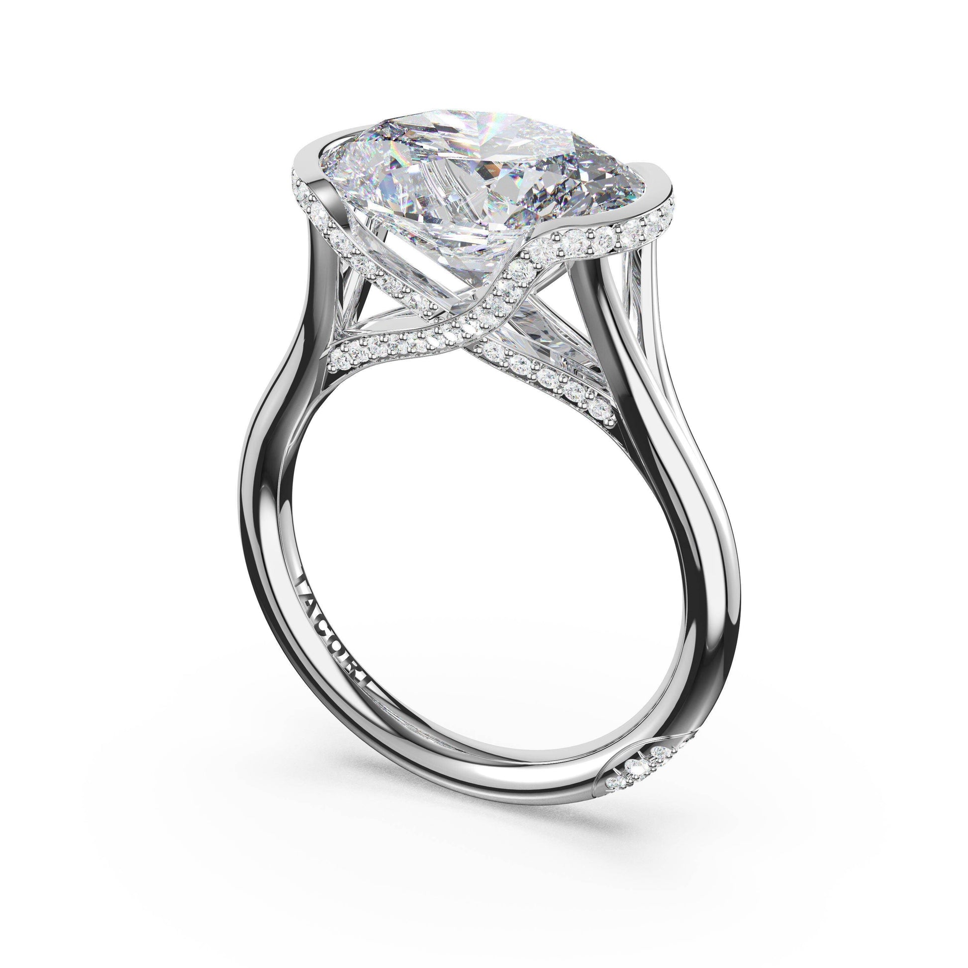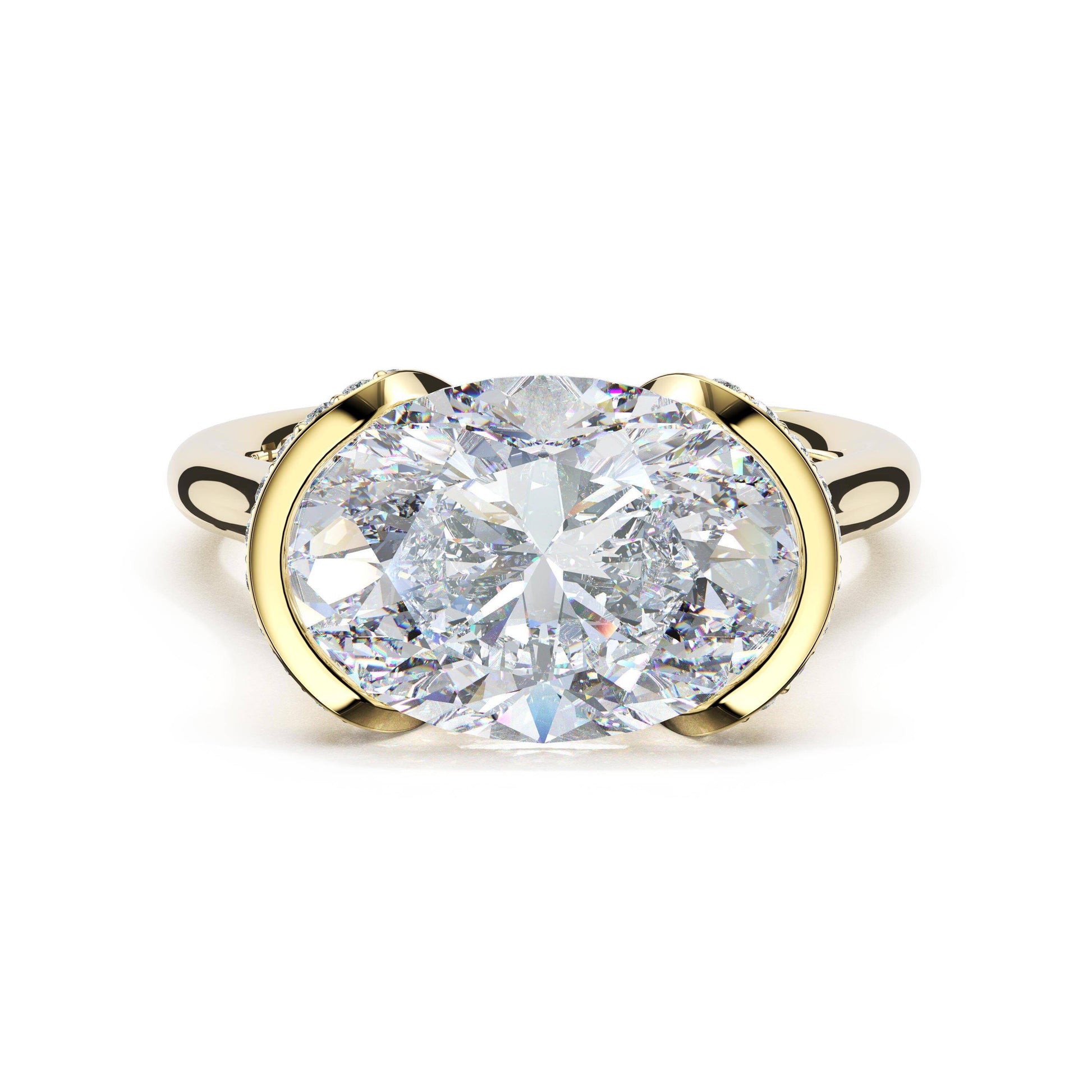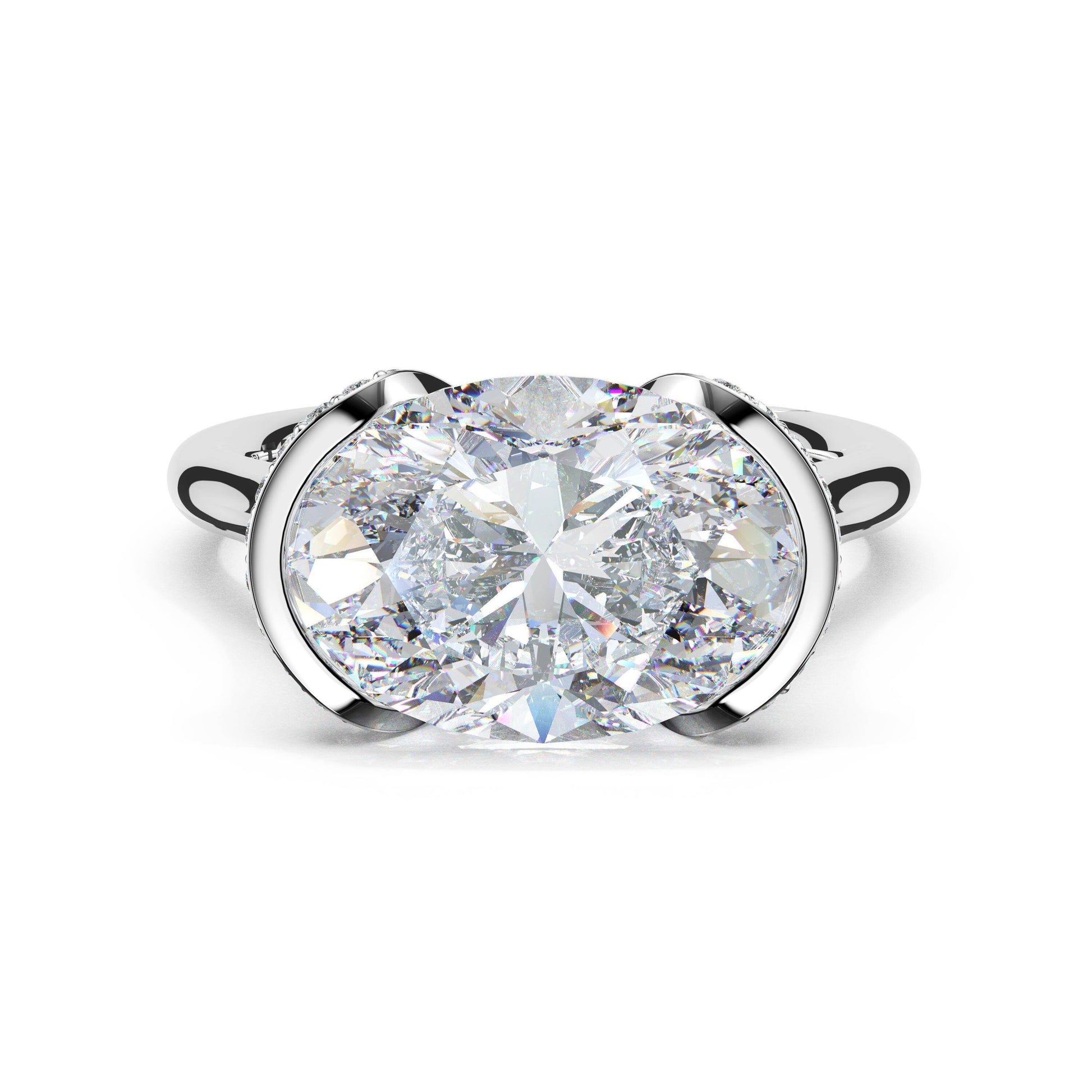 A unique pavé-crossed Cathedral setting elevates a magnificent, bezel-set oval-cut diamond band.