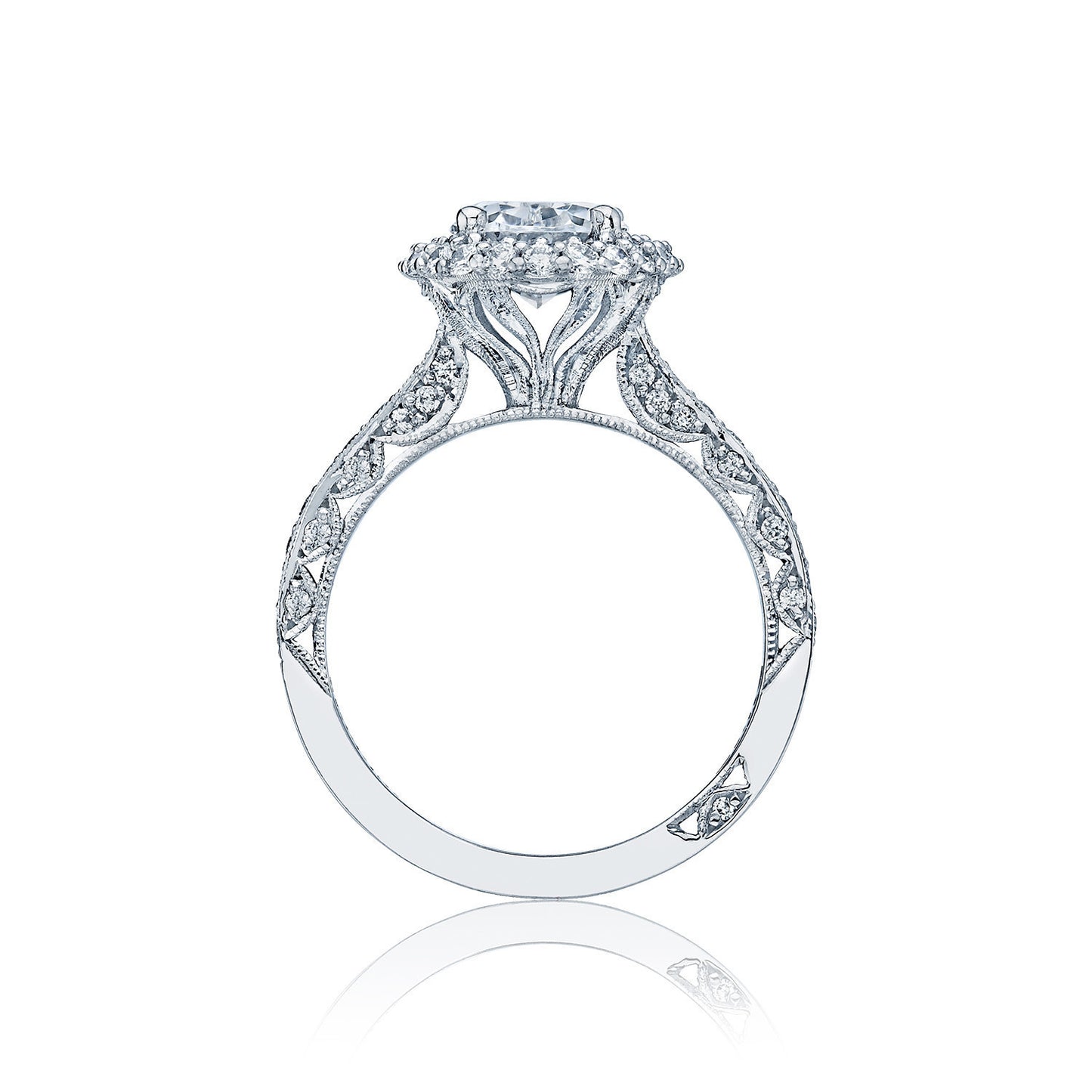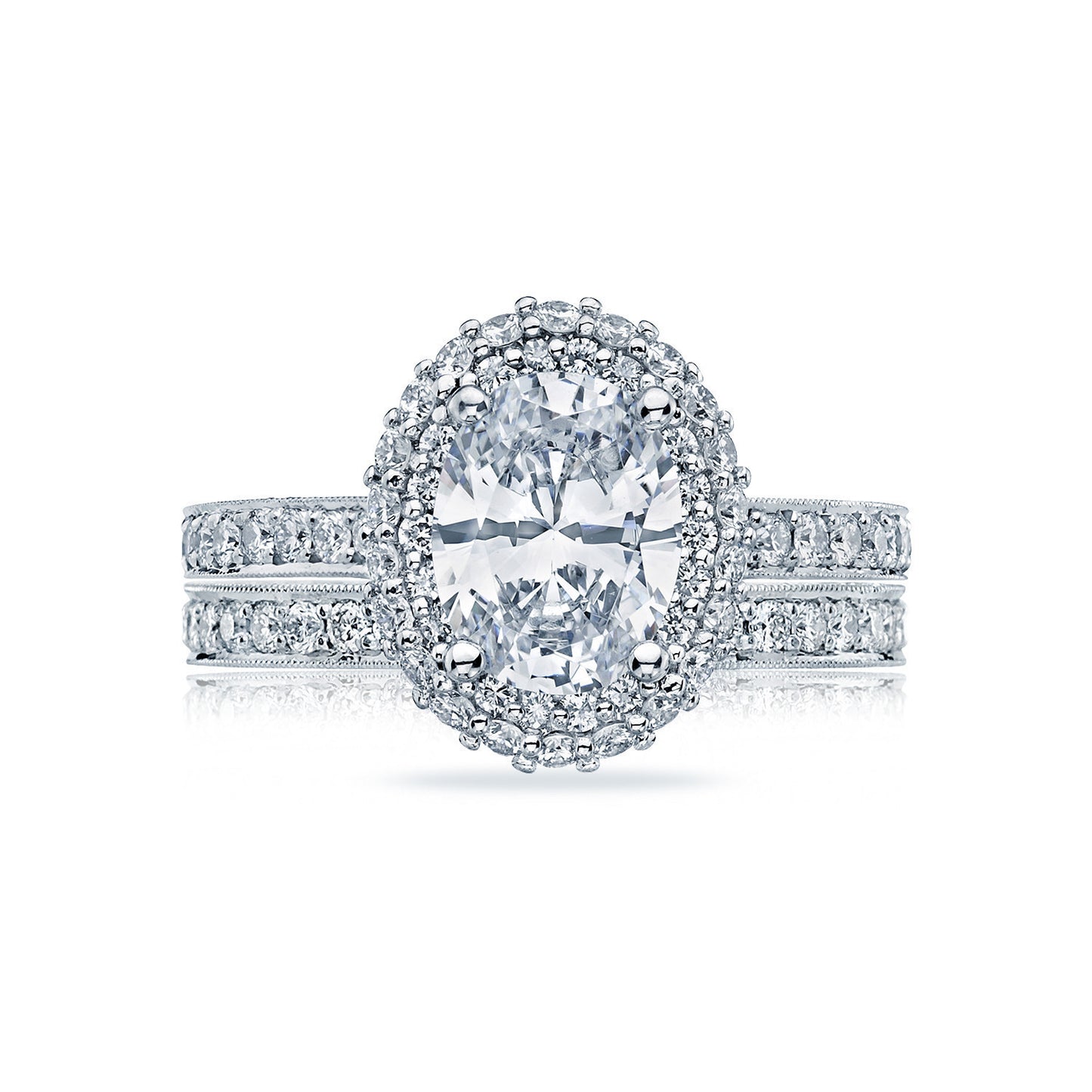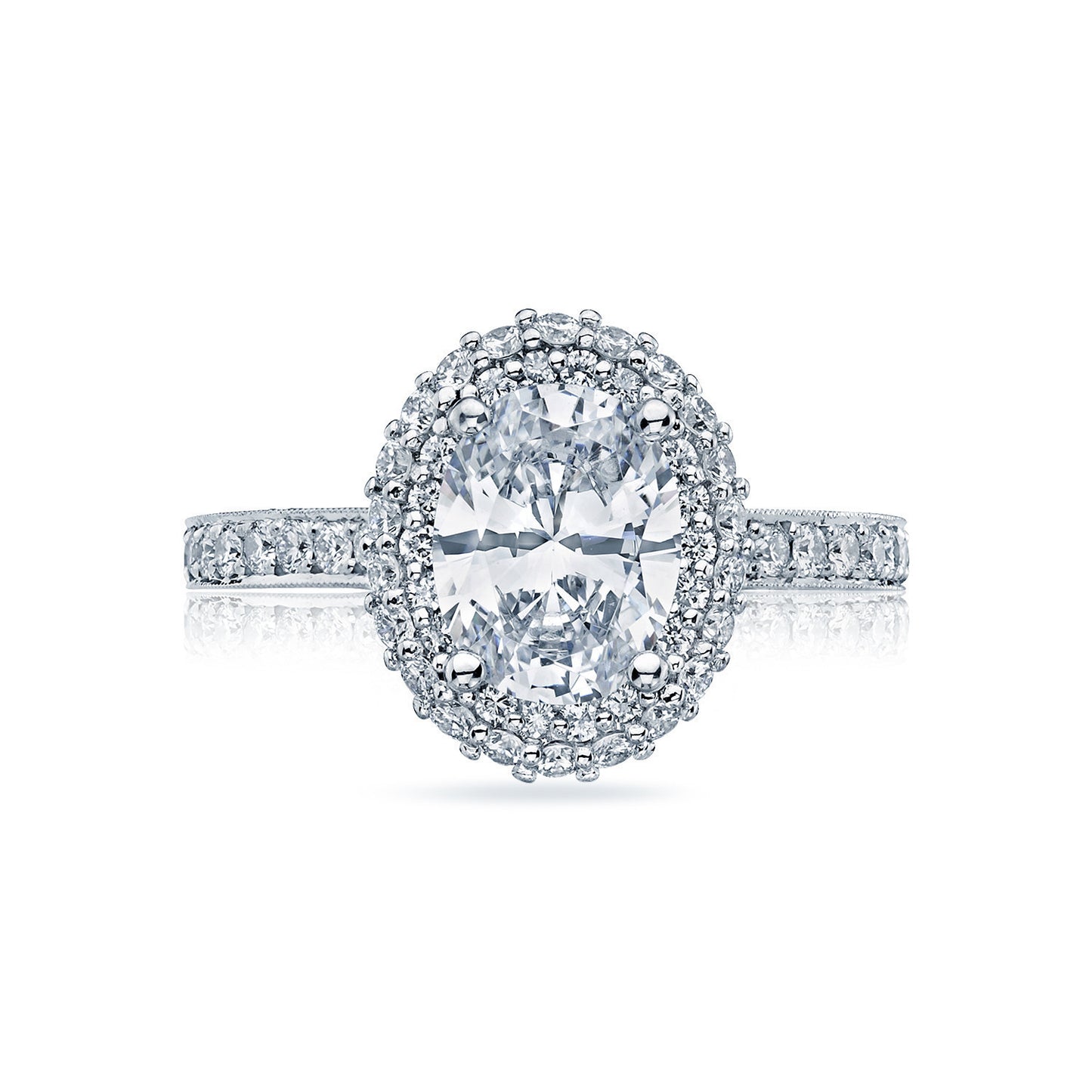 A dazzling double bloom surrounds this glamorous, diamond-bedecked ring, fit for an oval-shaped center diamond. Feminine details make this ring the ultimate in elegance.Diamond Shape