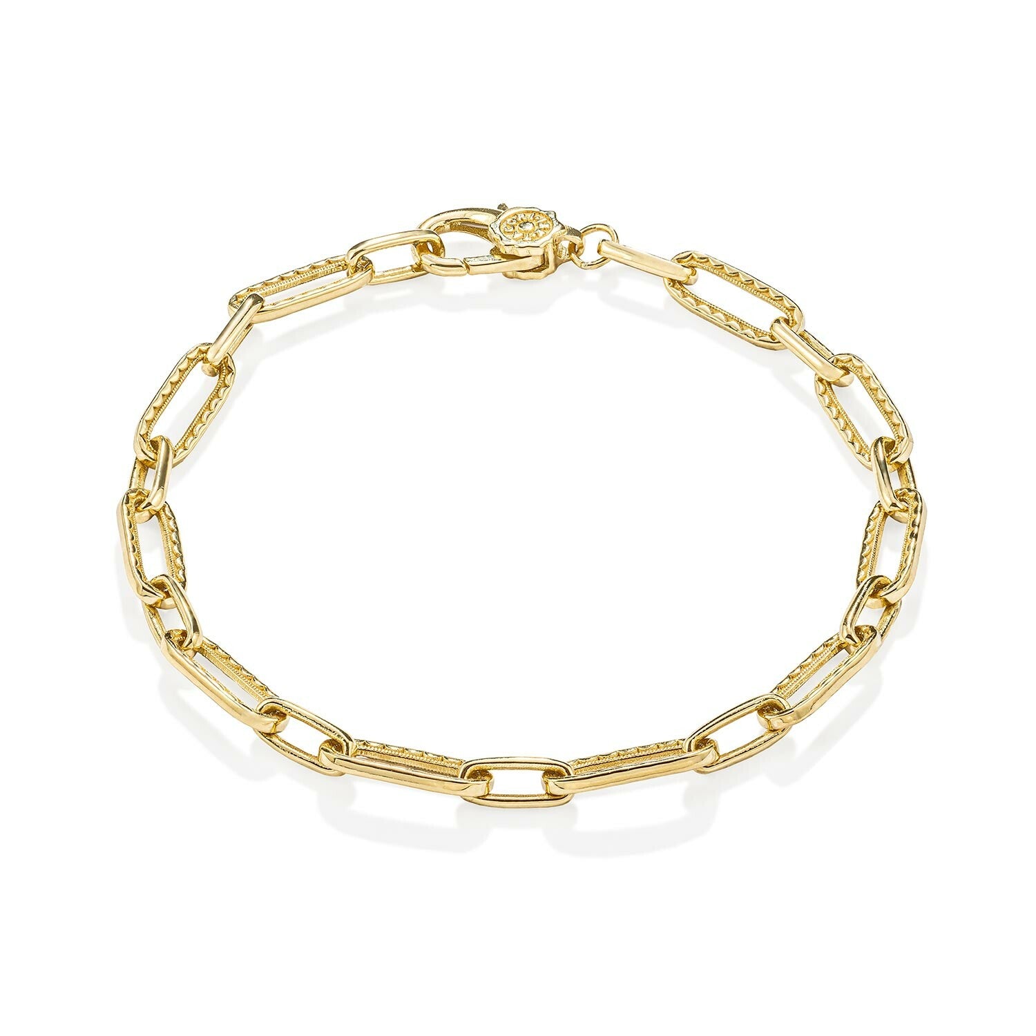 An innovative single-cast, no solder chain of 18 karat yellow gold links are decorated with hand-hewn milgrain and intricate, hand-carved TACORI Crescent detailing. This bracelet is timeless, elegant, and showcases TACORI's unmatched artisanry.