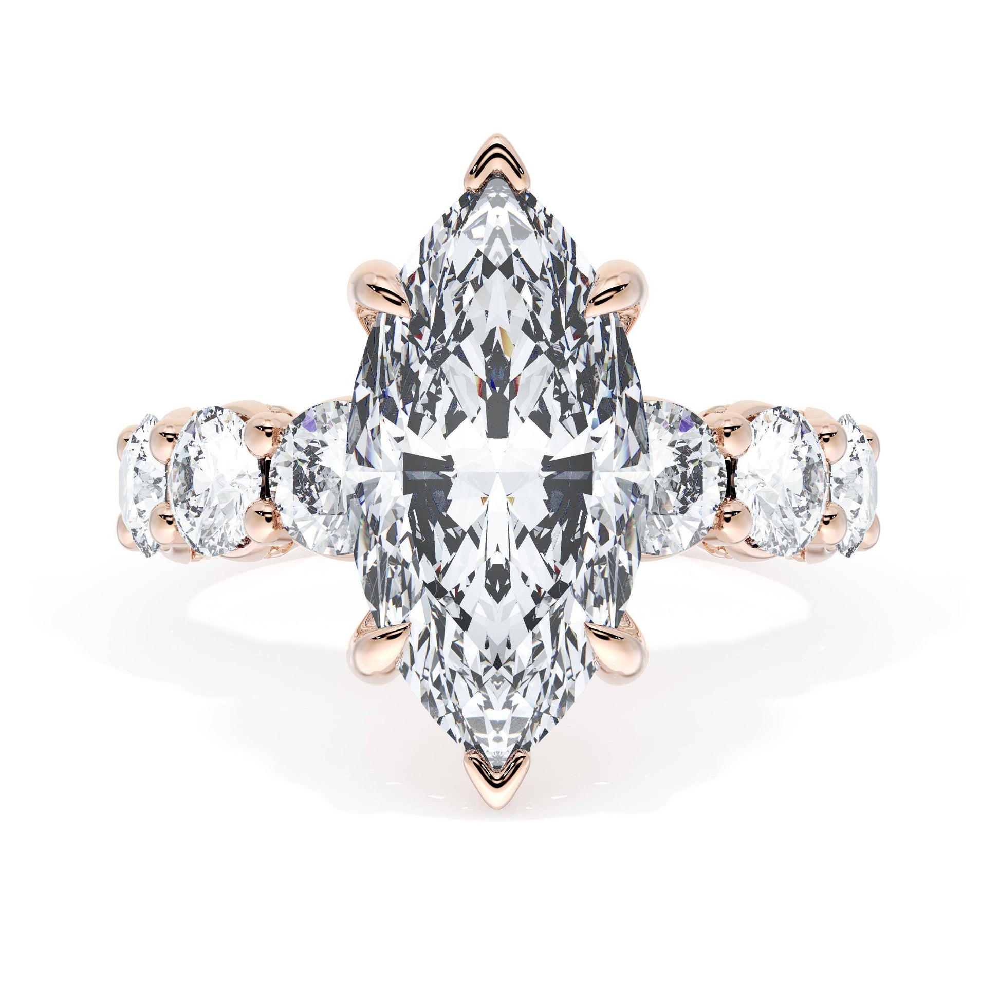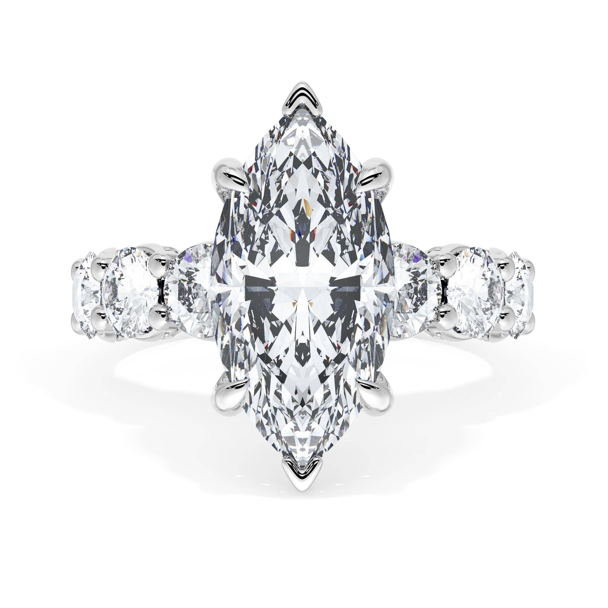 Six round brilliant side stones decorate the ceiling of this Marquise cut solitaire. A hidden bloom and milgrain Crescents on the silhouette add hidden detail.
