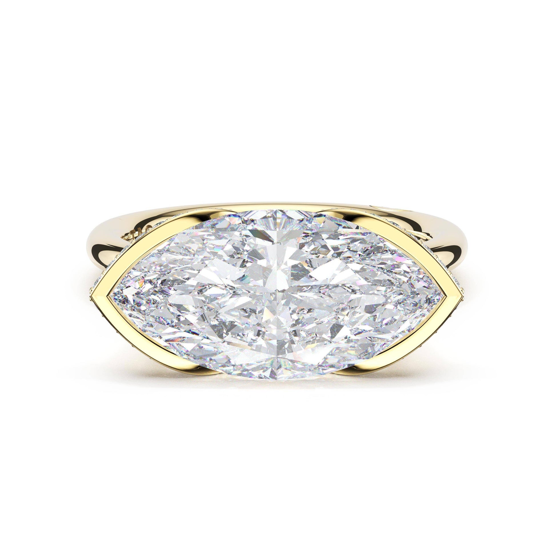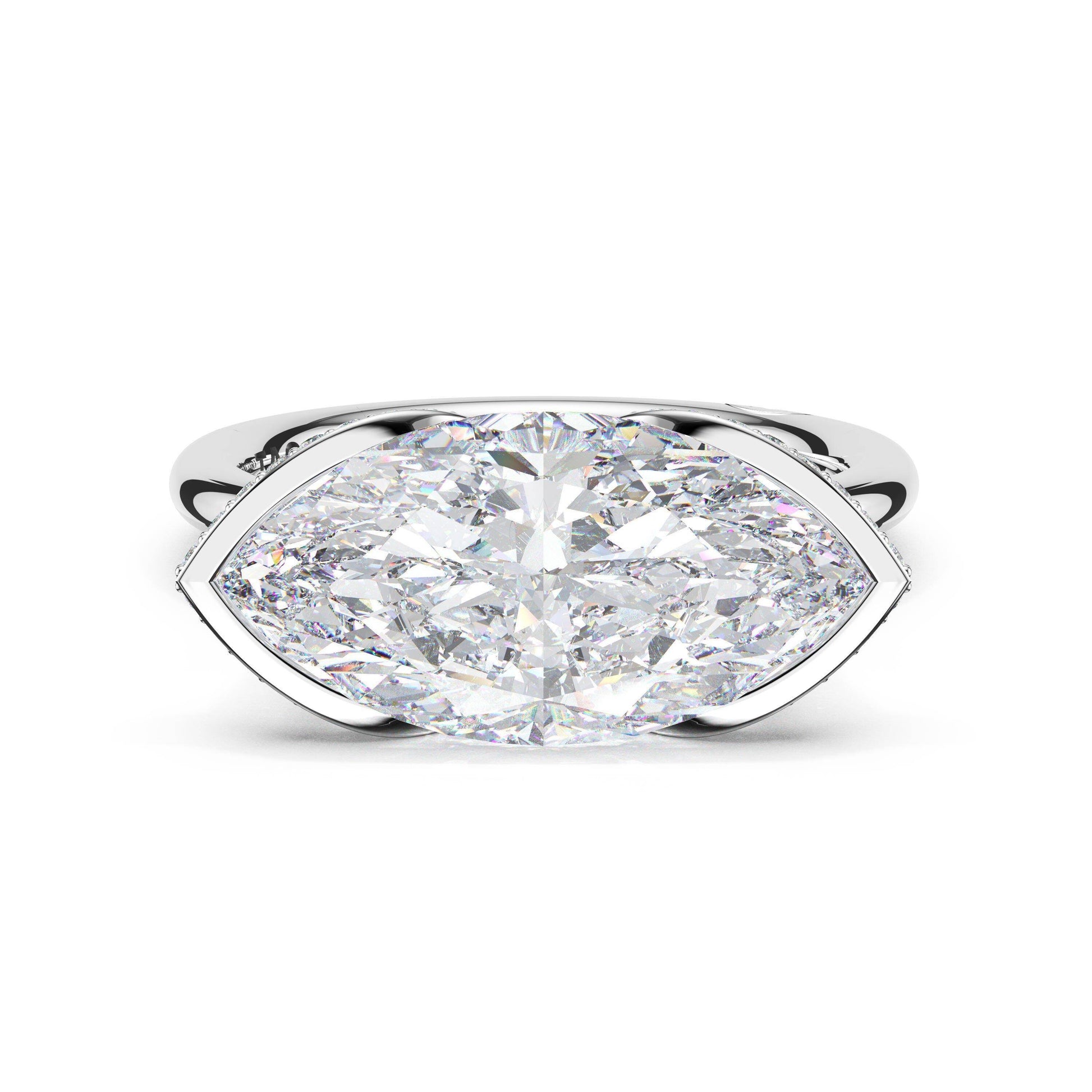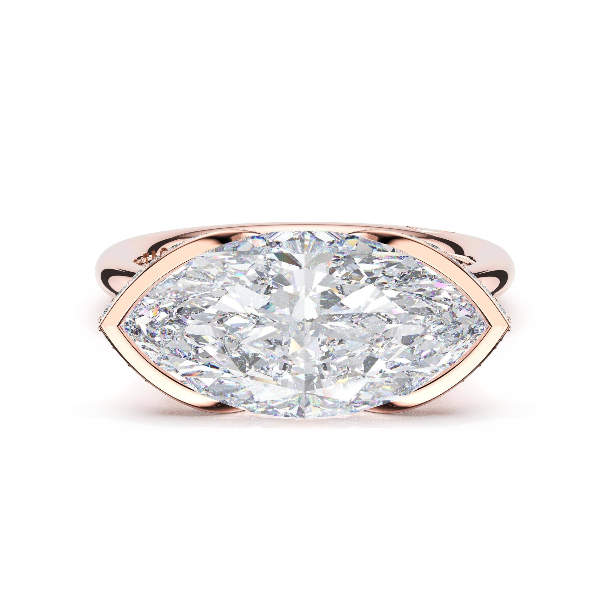 A unique pavé-crossed Cathedral setting elevates a magnificent, bezel-set marquise-cut diamond band.