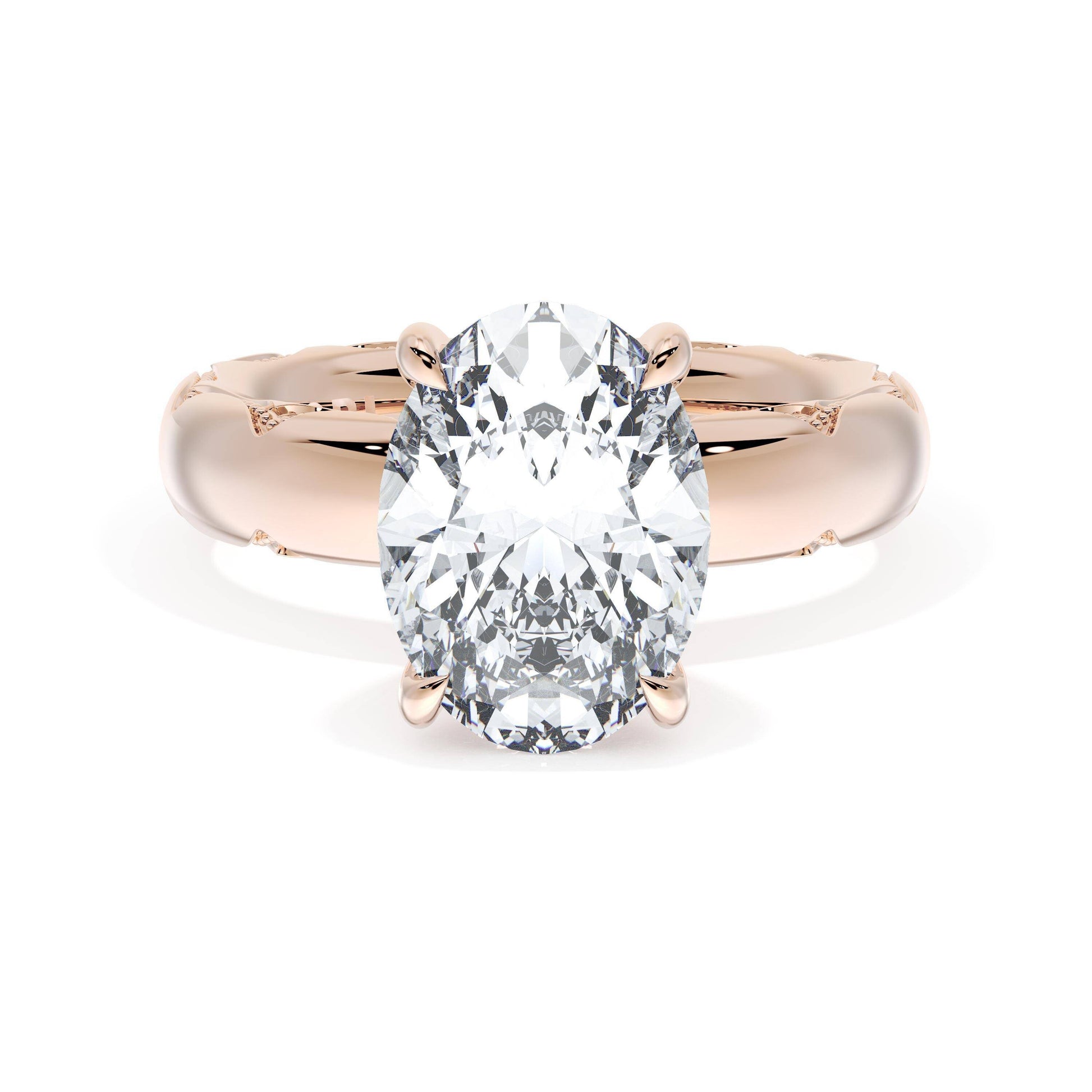 An Oval cut diamond sits atop a bold cigar-style band, decorated with milgrain Crescent detailing on the silhouette.