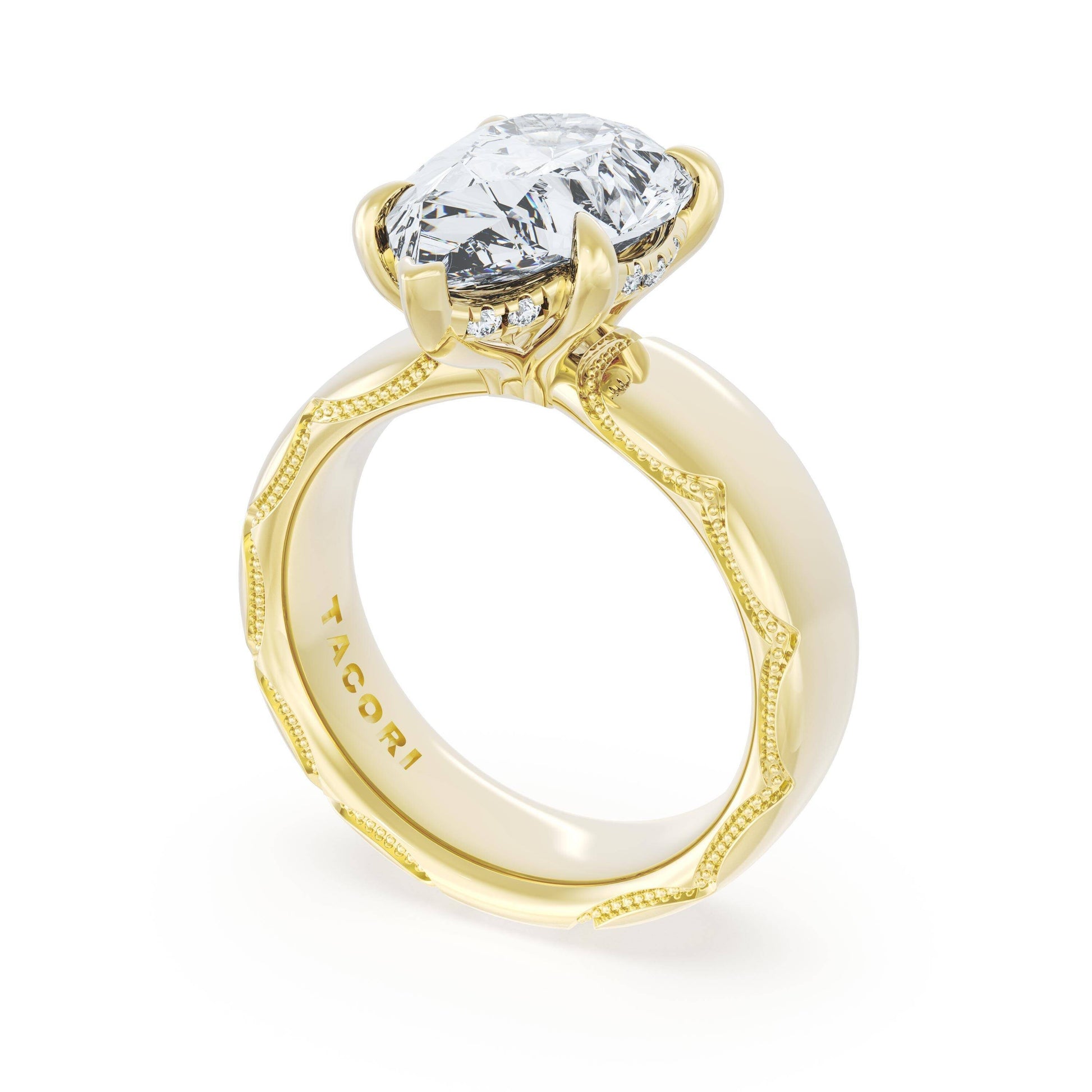 A Pear cut diamond sits atop a bold cigar-style band, decorated with milgrain Crescent detailing on the silhouette.