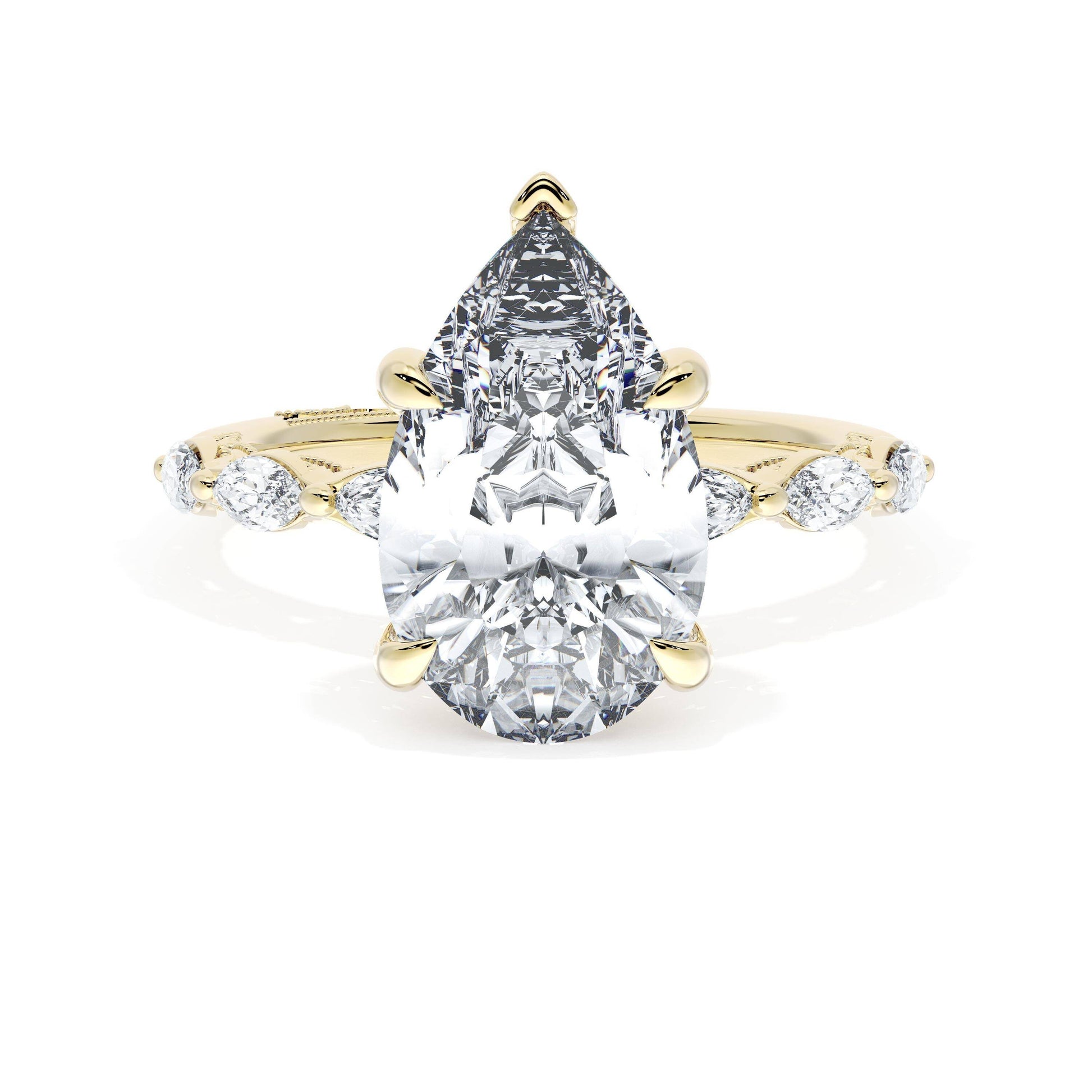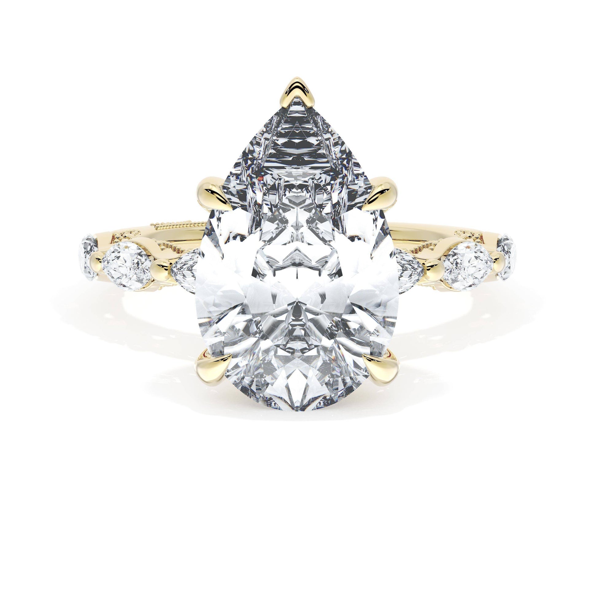 Six marquise cut side stones decorate the ceiling of this Pear cut solitaire. A hidden bloom and milgrain on the silhouette add hidden detail.