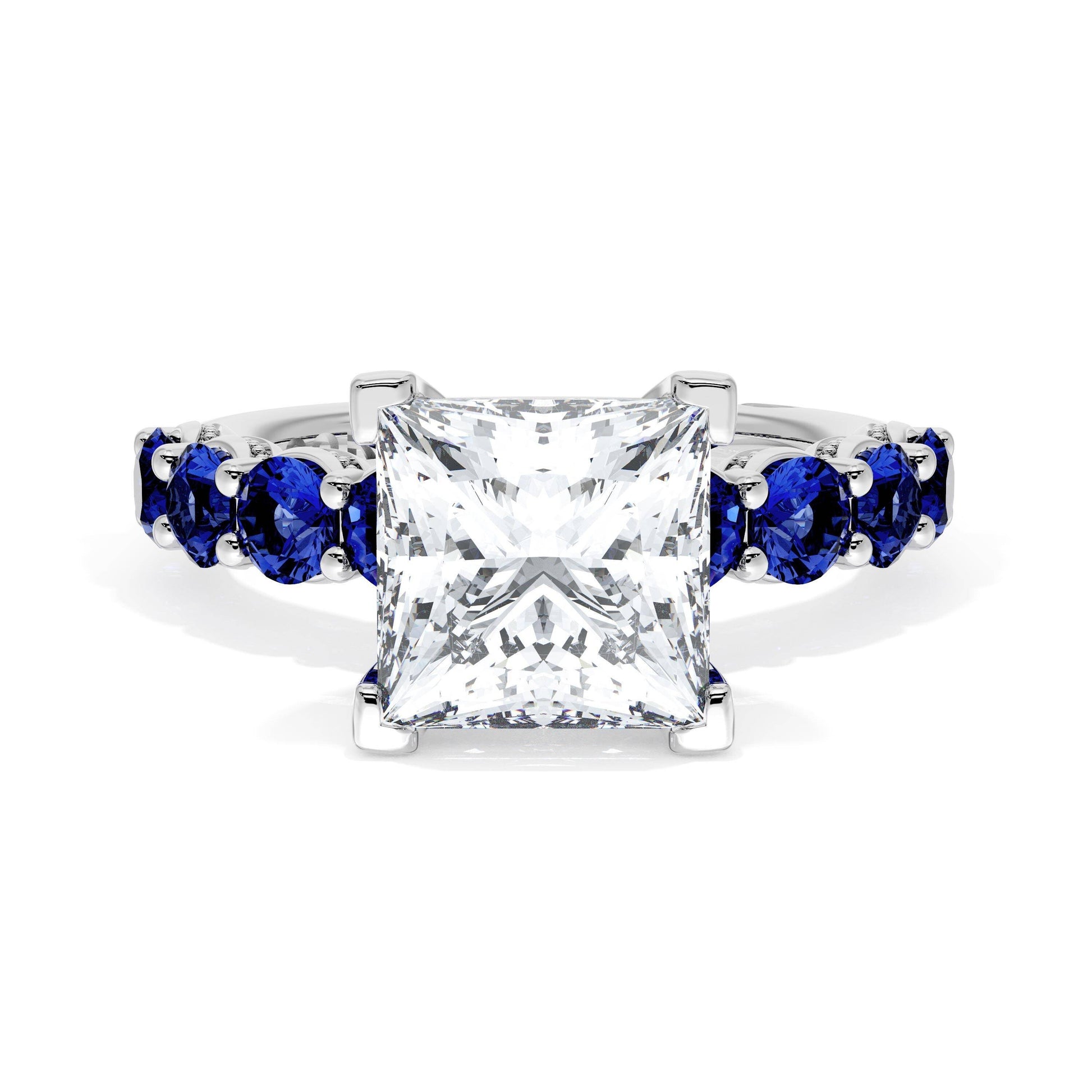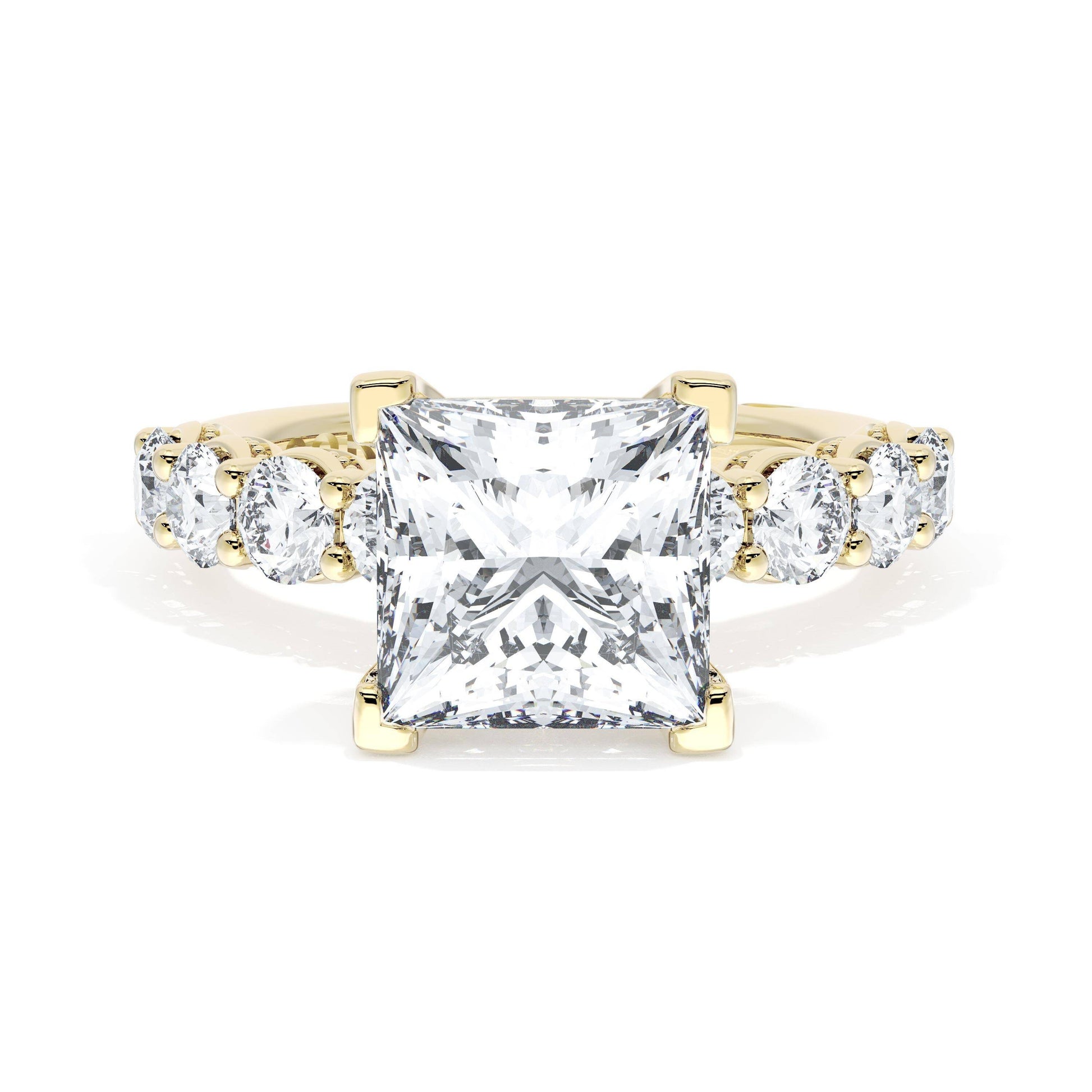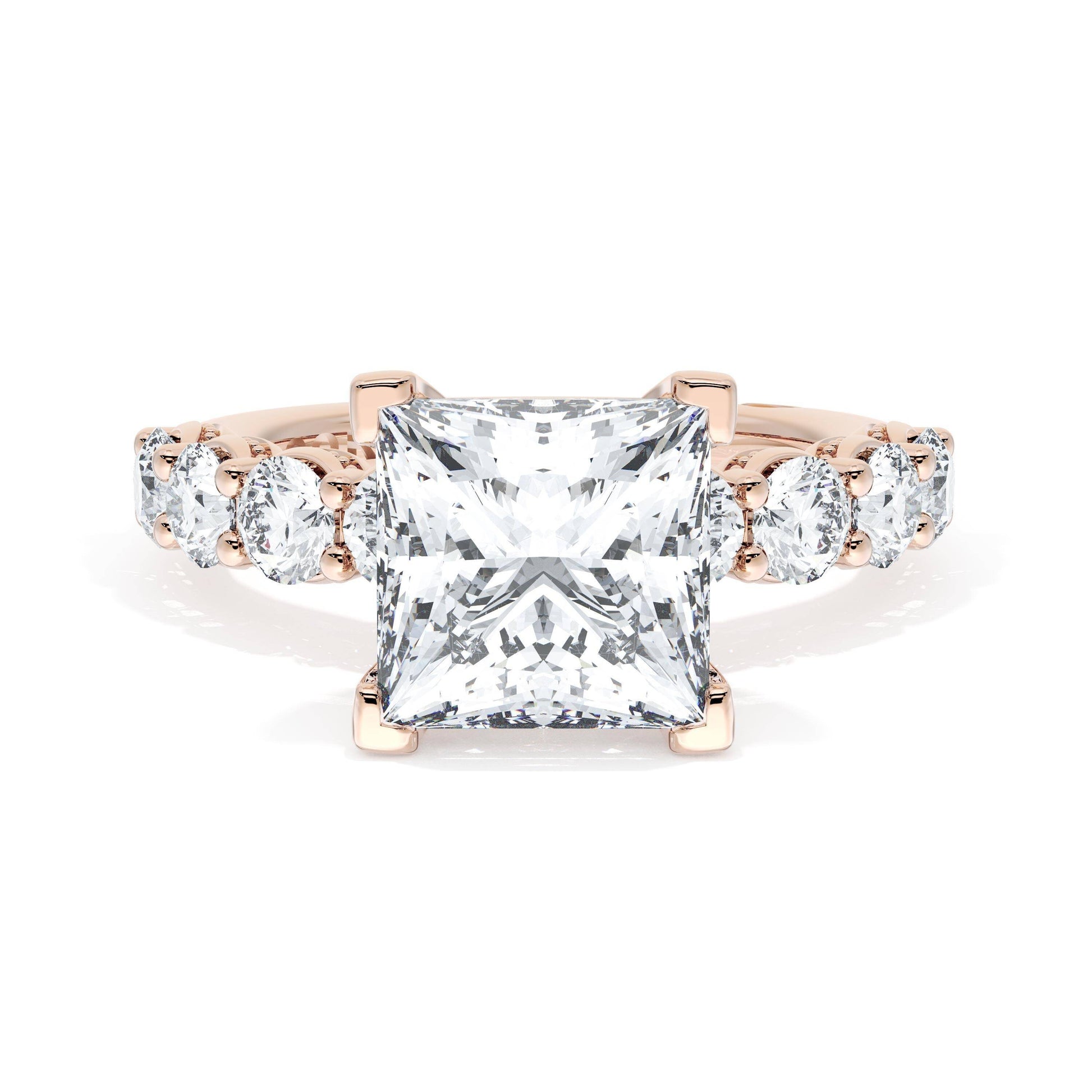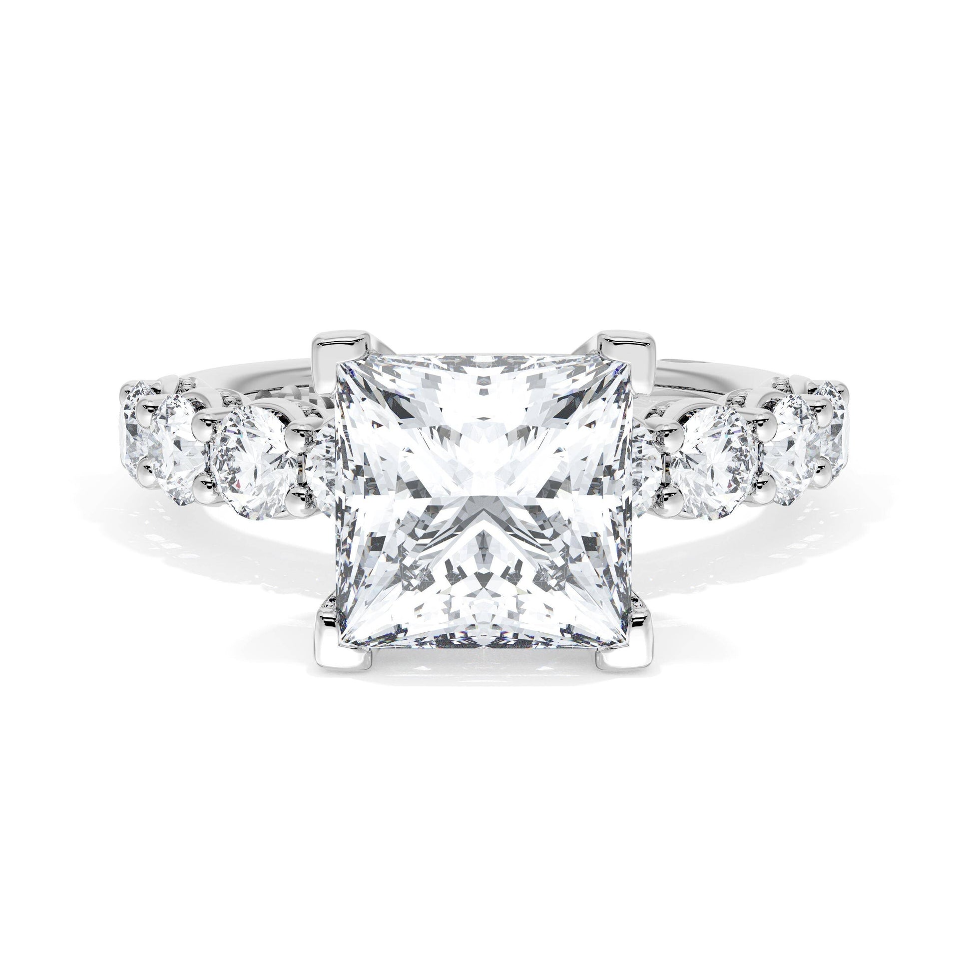 Eight round brilliant side stones decorate the ceiling of this Princess cut solitaire. A hidden bloom and milgrain Crescents on the silhouette add hidden detail.