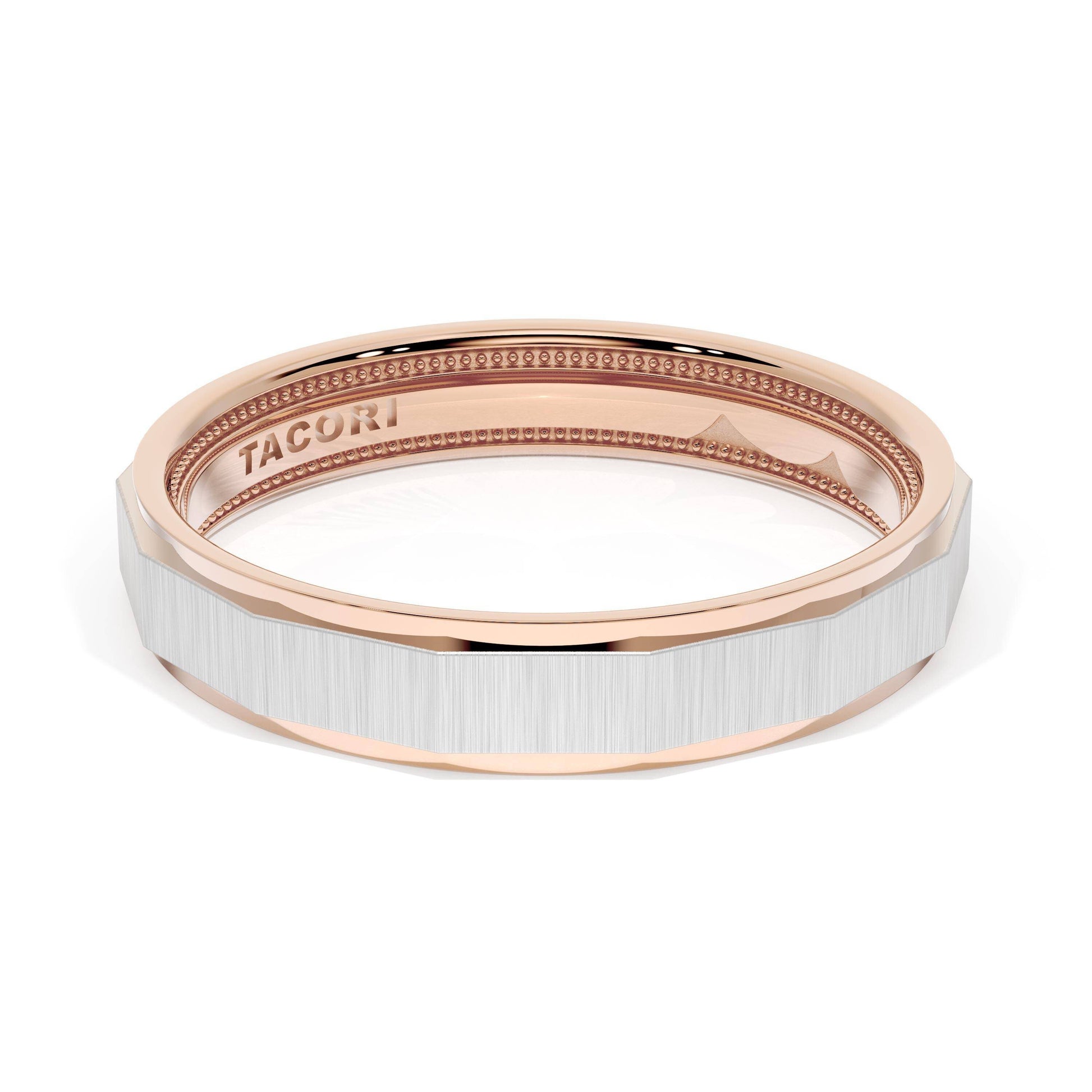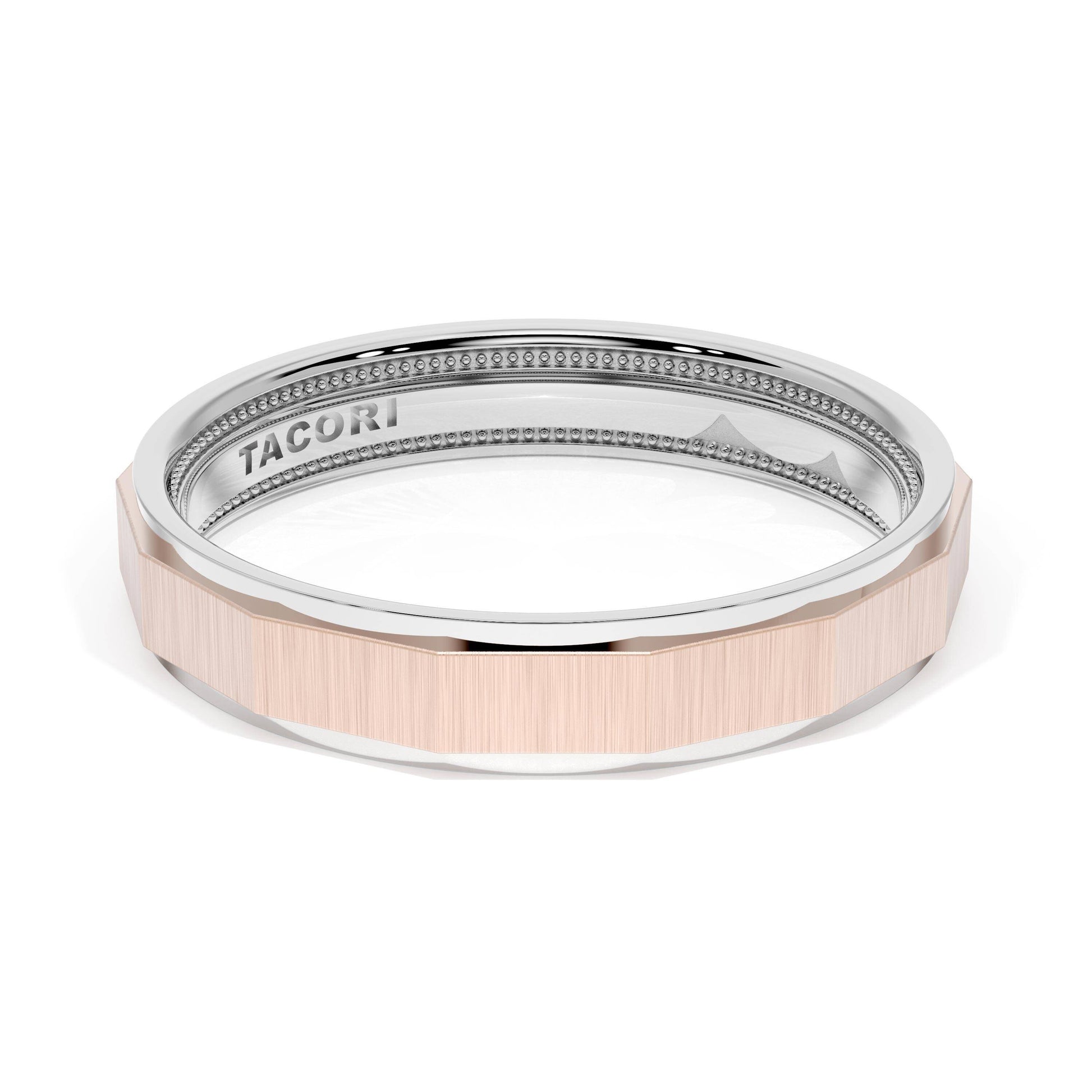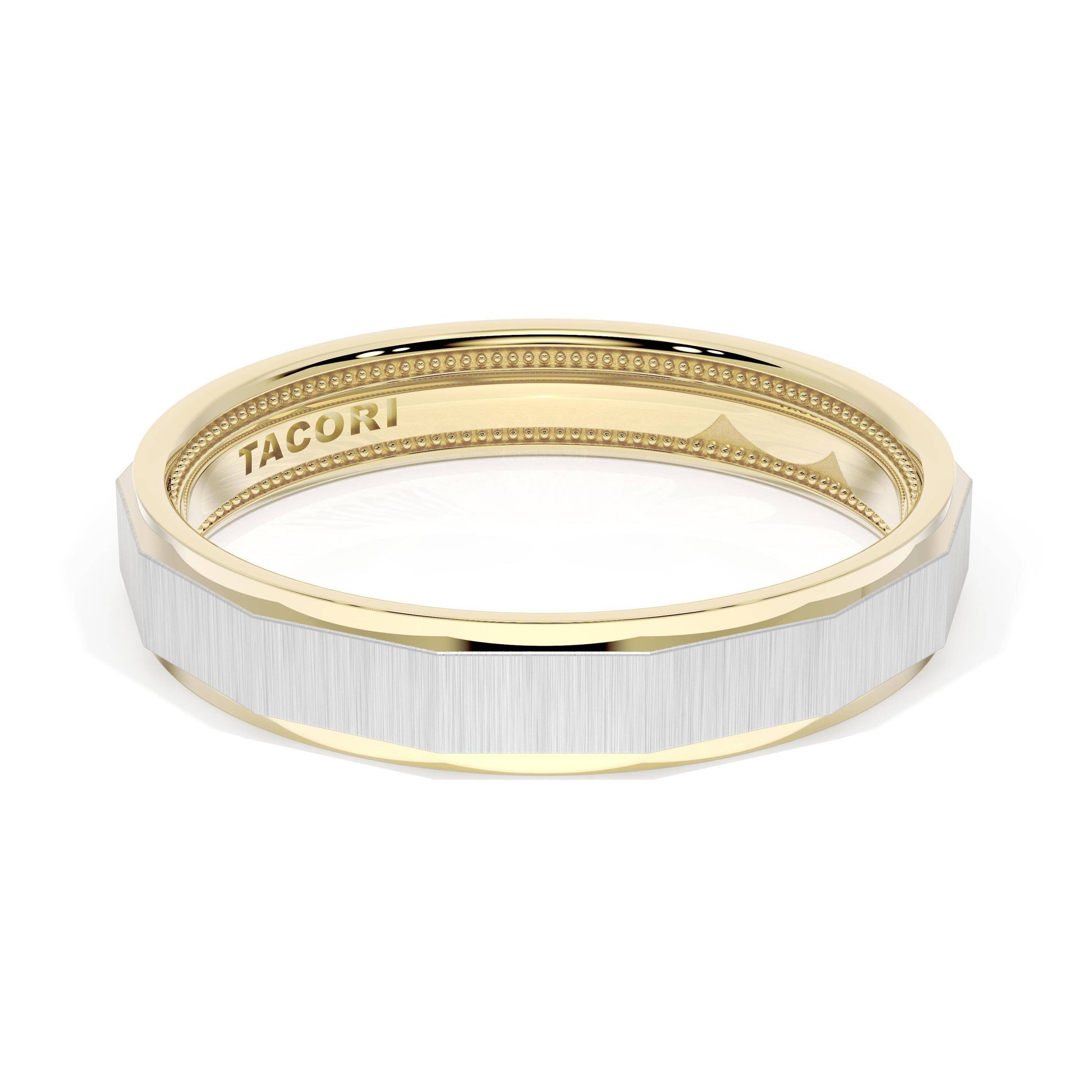 This two tone band features a geometric ceiling with a satin finish and milgrain detailing on the inner face.