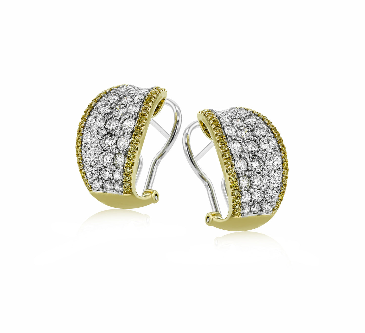 Dazzling and glamorous, these earrings sparkle with 2.37 ctw of round white diamonds and .43 ctw of yellow diamonds set in complementary two-tone gold.