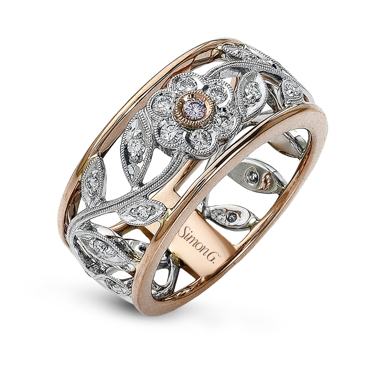The vintage floral design of this white and rose gold band is highlighted by .30 ctw round cut white diamonds and .03 ctw round cut pink diamond accents.Want to see this Fashion Ring in person?