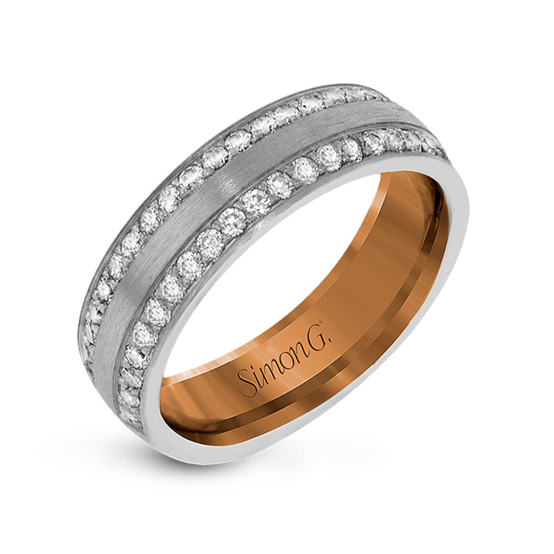 This two-tone 14k wedding band is a stunner with two rows of .50 ctw of white diamond set in rose gold along the outside, and 14k white gold on the interior.