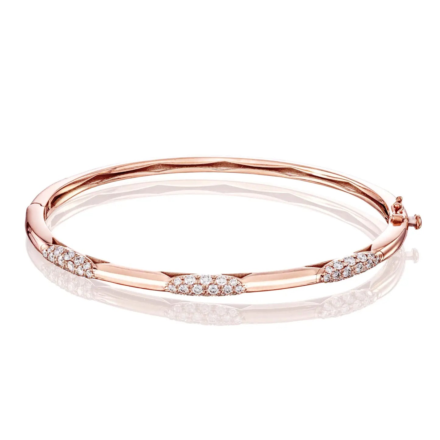 Three diamond-studded crescent-shaped ellipses add meticulous and eye-catching detail to this delicate - yet bold - bangle of 18Kt gold.