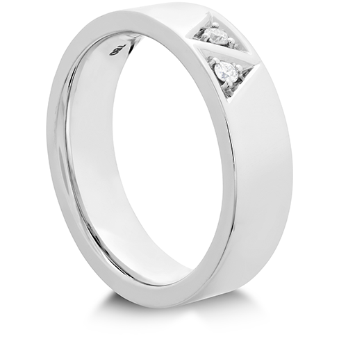 This sleek metal design features two diamonds set in side-by-side triangles on a solid metal band for a geometric take on a traditional silhouette. The width measures in at 6 MM, so it has a thicker look and feel.